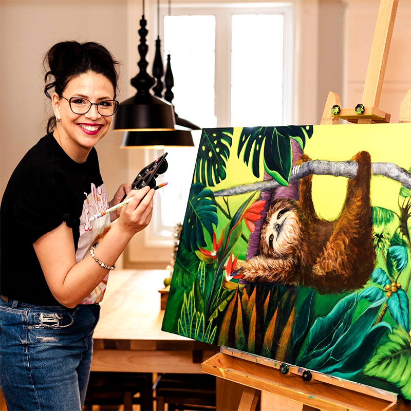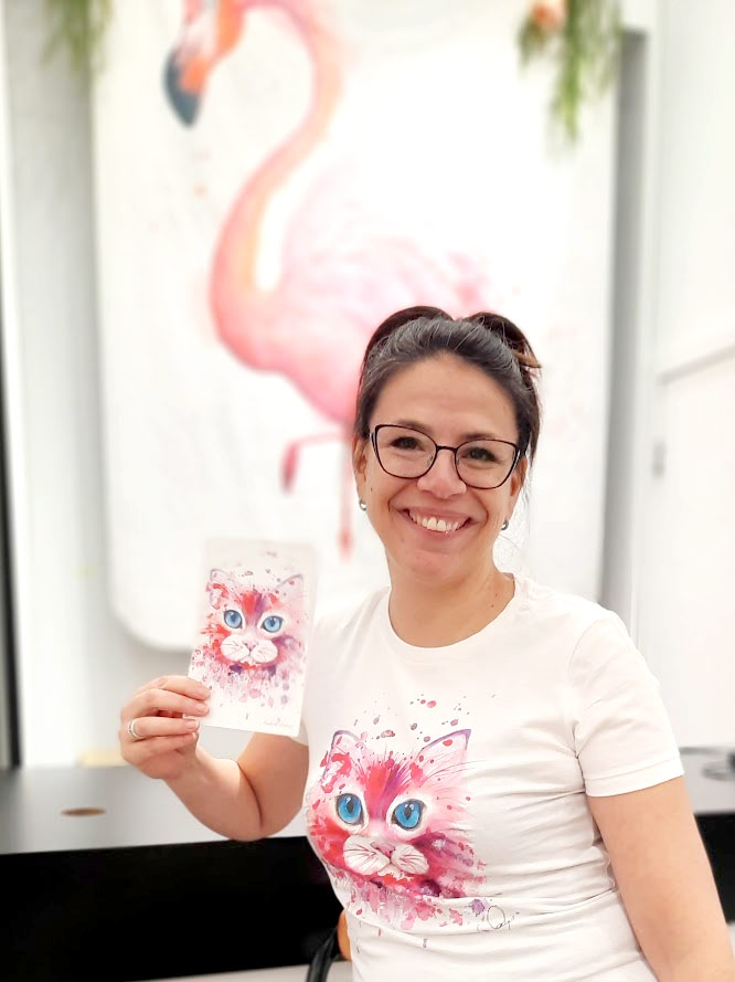 J’ai débuté la peinture avec les cartes de souhaits, très rapidement j’ai voulu créer des articles à l’image de mes œuvres. Les produits dérivés rendent l’art accessible et personnel, Maintenant, je glisse également mes pinceaux sur grand format, mais créer des objets uniques et personnalisés découlant de mes œuvres fait partie intégrante de ma démarche artistique